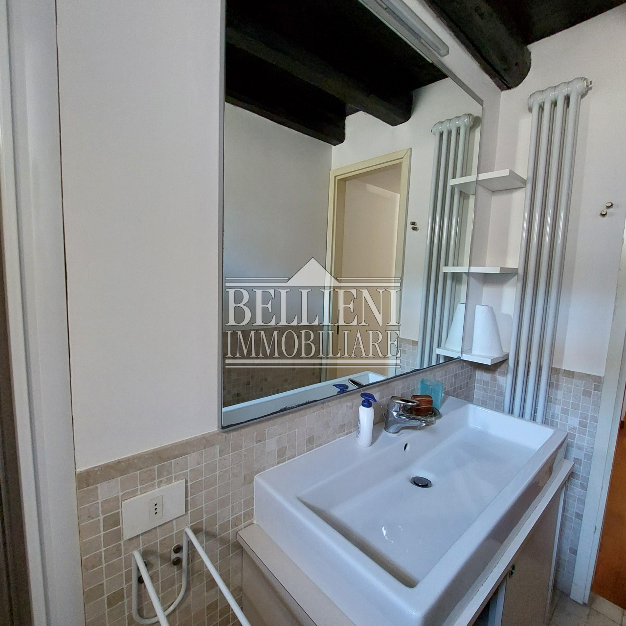 Riscaldamento autonomo con radiatori tubolari, travatura scura e impianto di condizionamento.
