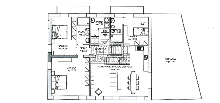 L'attico offre spazi ben distribuiti e confortevoli, e si compone di: ingresso, soggiorno/sala da pranzo accogliente con cucina in open space con accesso all'ampia terrazza di 50 mq, una camera singola con servizio privato, due camere matrimoniali, servizio e lavanderia.