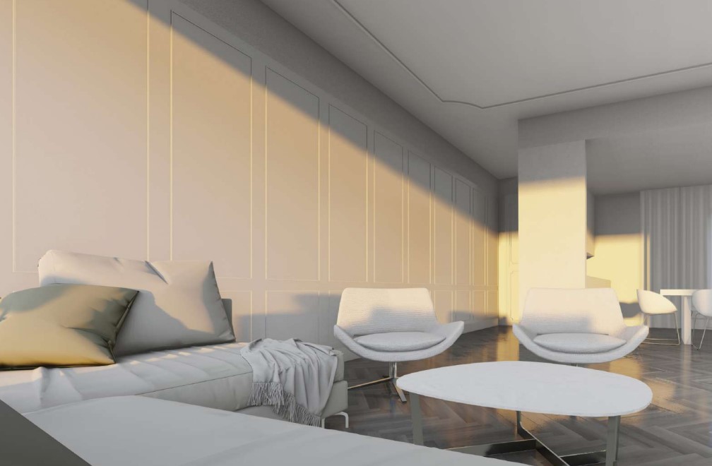 Gli interni sono stati progettati con uno stile minimalista, i pavimenti sono in parquet di rovere a spina di pesce. Domotica avanzata, sistema di climatizzazione canalizzata e riscaldamento a pavimento e raffrescamento canalizzato.